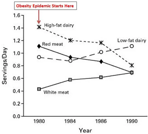 It amazes me that some people still blame traditional foods like meat and butter for the diseases of civilization. These foods have sustained humans in good health for a very long time and blaming new diseases on old foods just doesn’t make sense. All the data shows that people actually reduced their consumption of these foods as these diseases went up. The graph above, from the Nurses Health Study, shows that Americans were reducing their intake of red meat and full-fat dairy at the same time the obesity epidemic was starting.